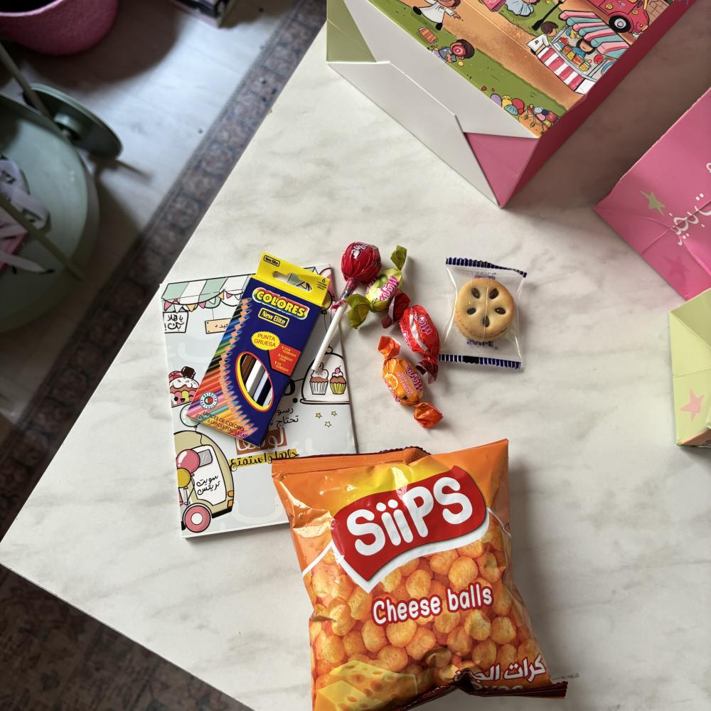 مع تعبئة ( كتيب رسومات - الوان - شبس - حلاو مصاص ومفرحات منوعة )