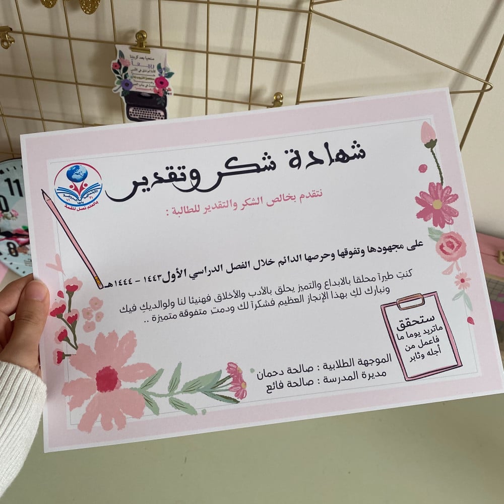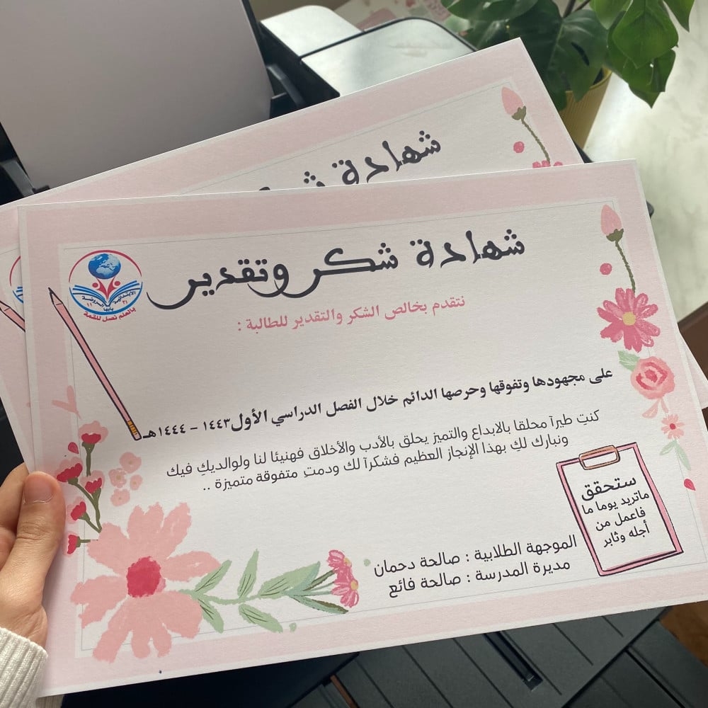 فخورة جدا باجتهادك ومثابرتك وتفوقك في مادة ........................ خلال الفصل الدراسي ........................ 144 هـ