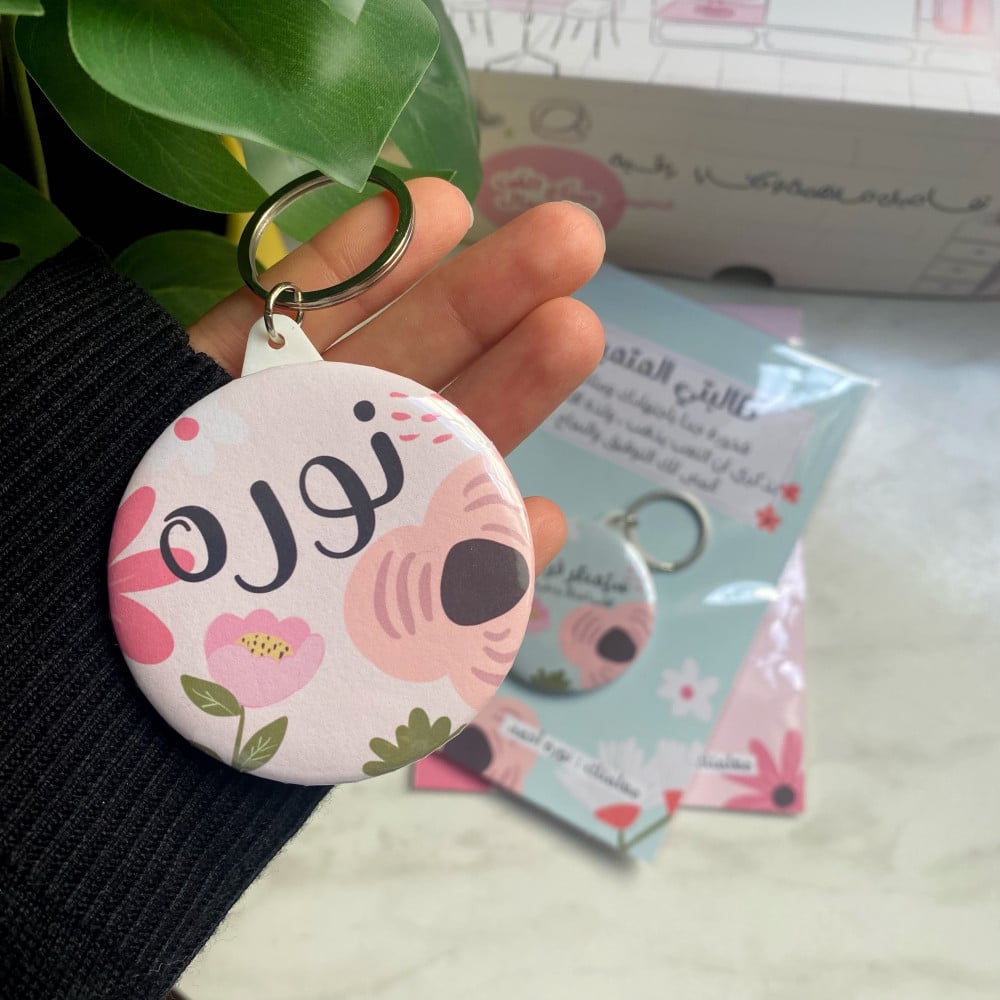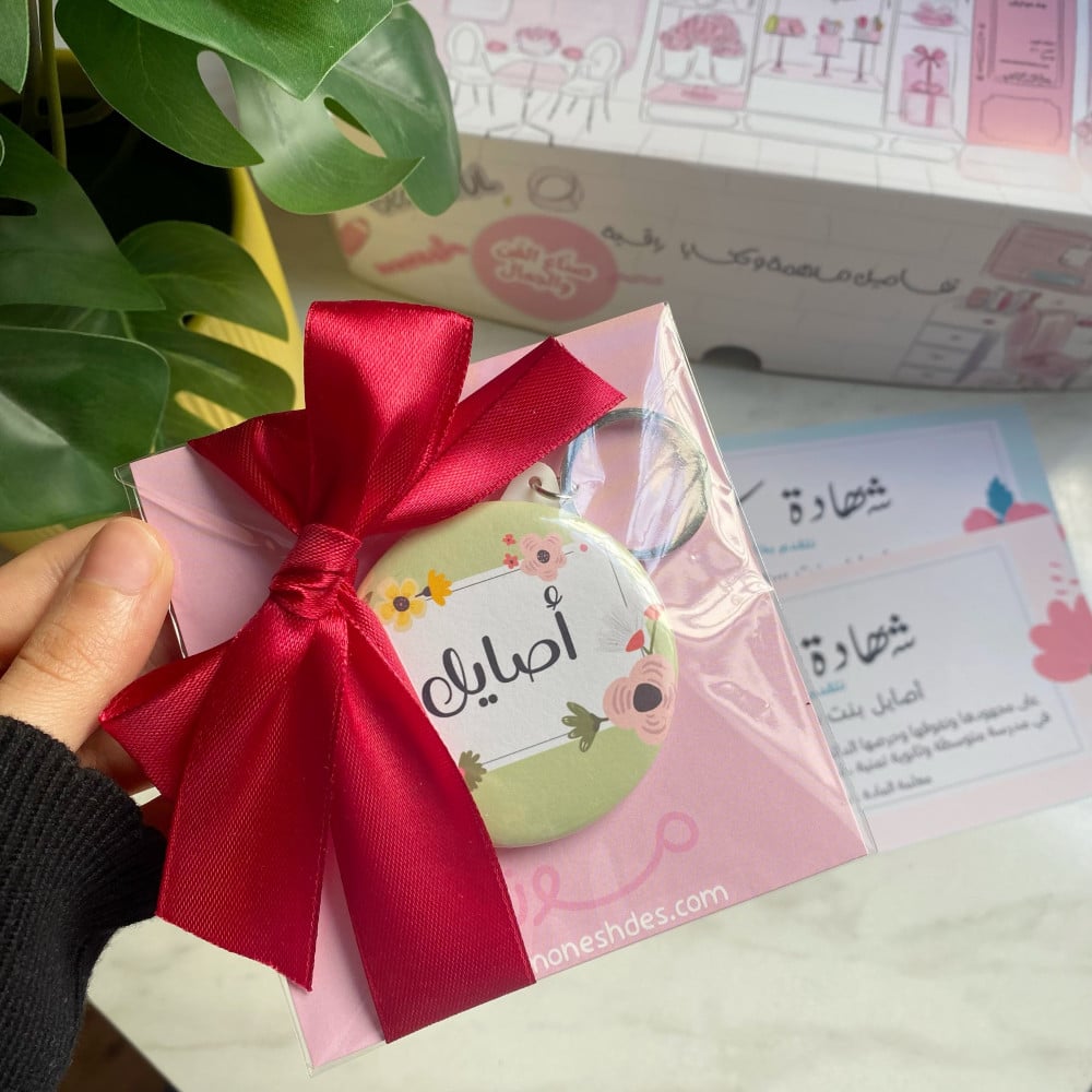 و كرت مغلف بشريطة بداخلة ( ميدالية ومراية بالاسم او بالعبارة )
