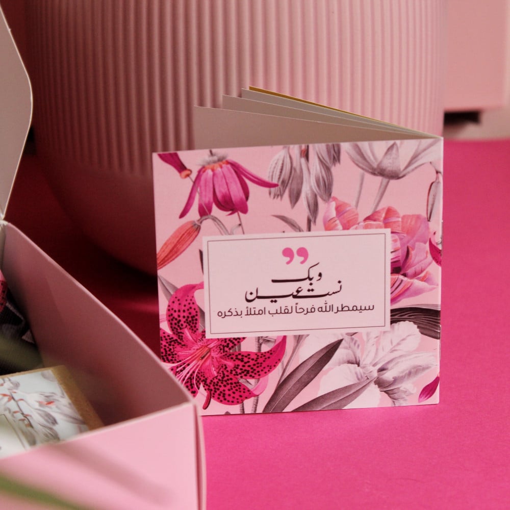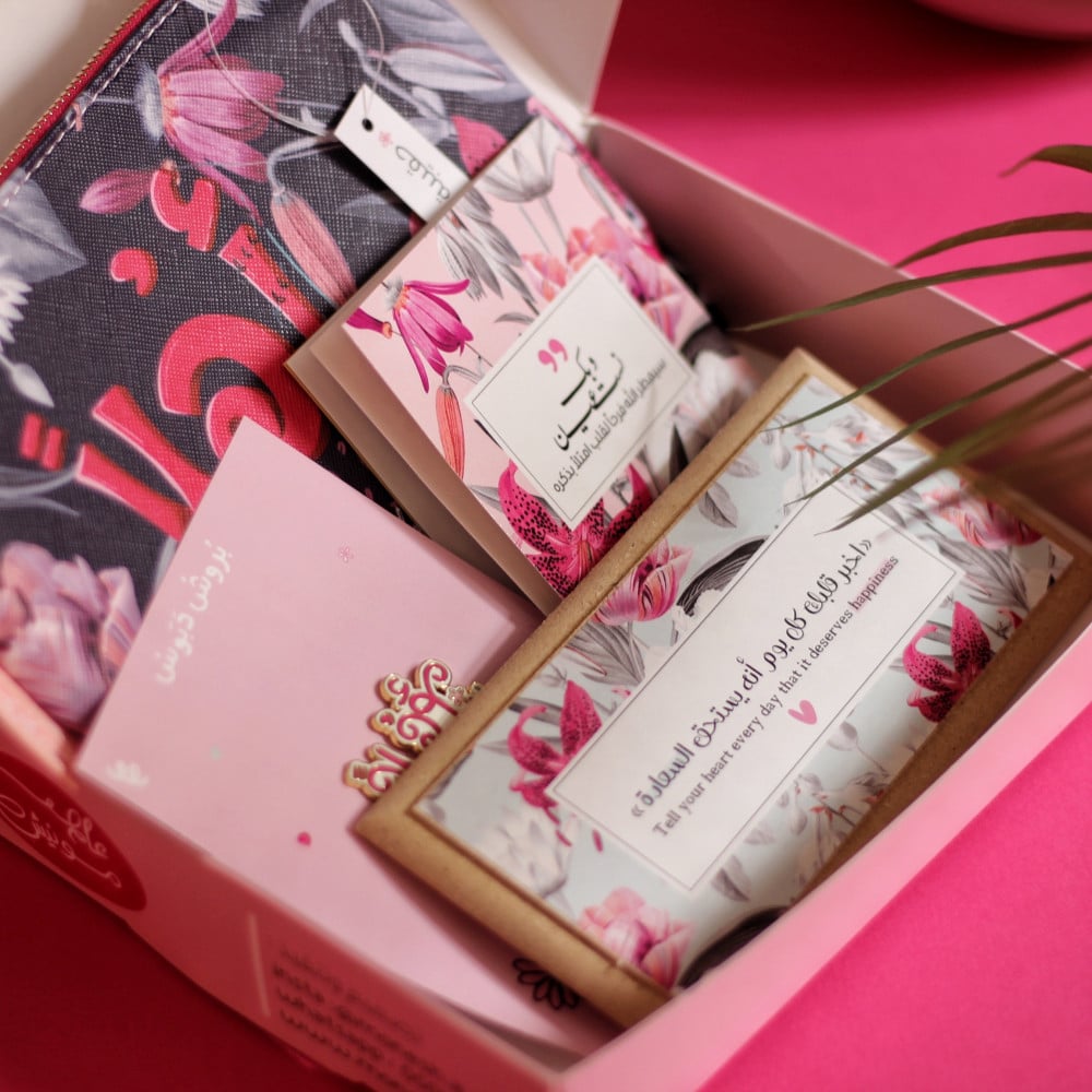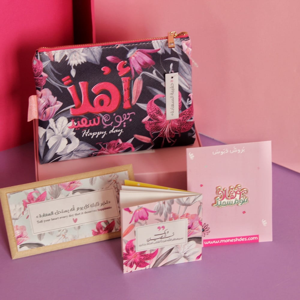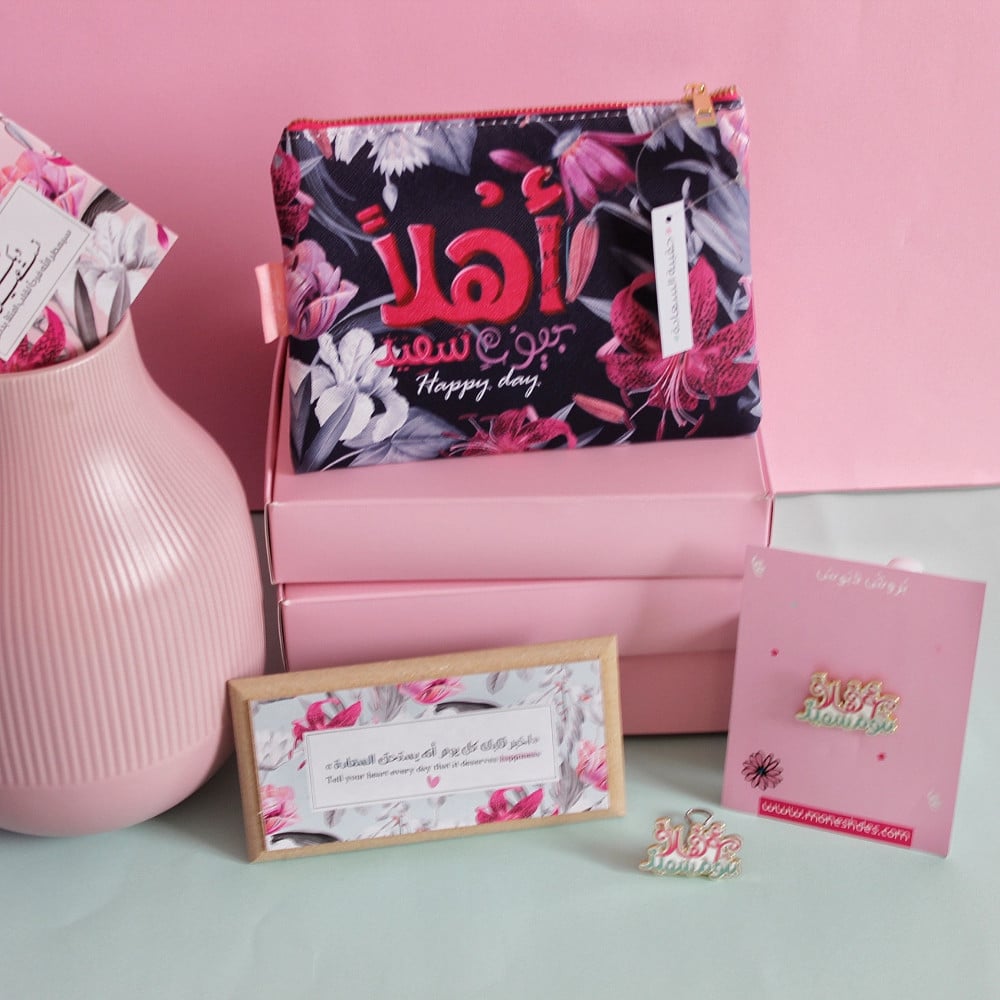يحتوي على صندوق بلون الوردي الدافئ وشعار ( أهلاً بيوم سعيد ) ببصمة ذهبية فاخرة