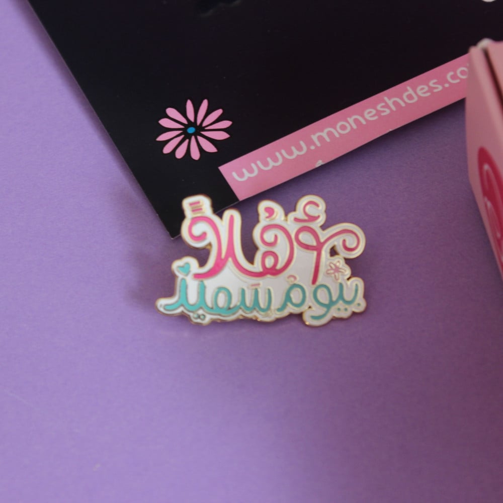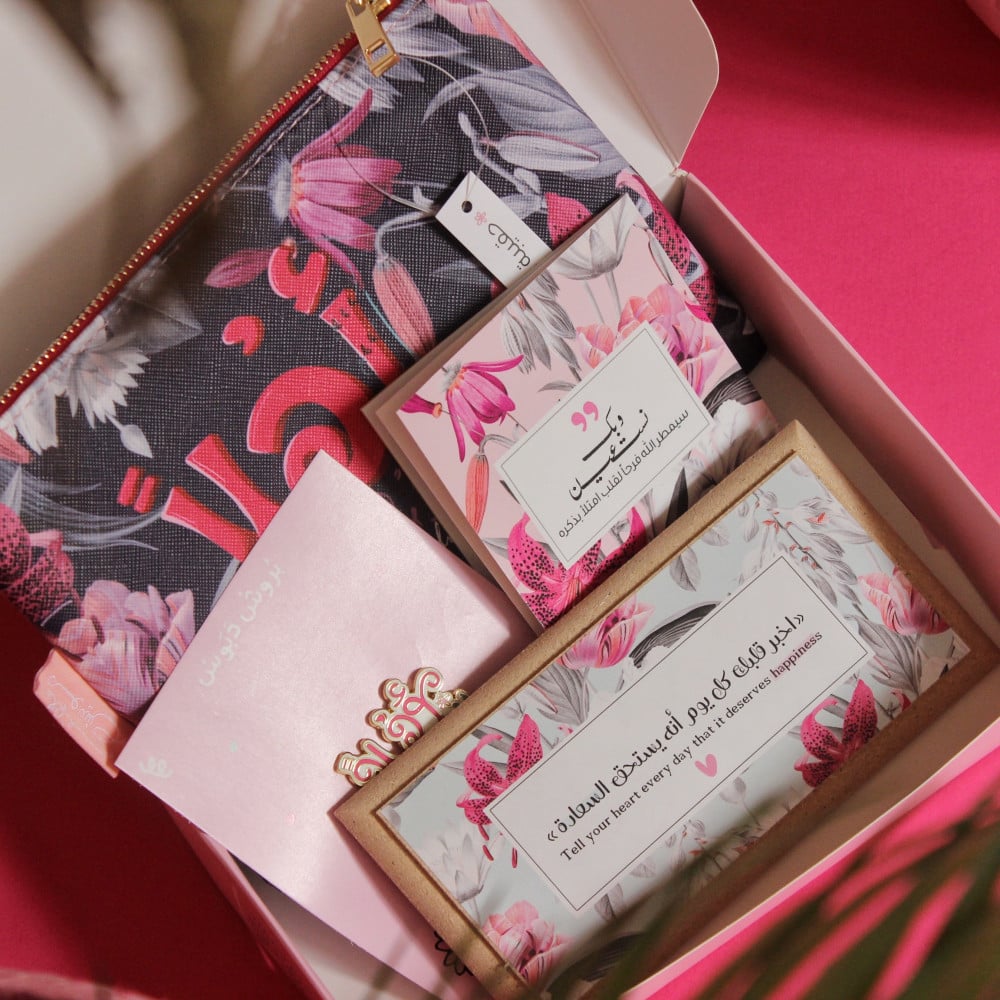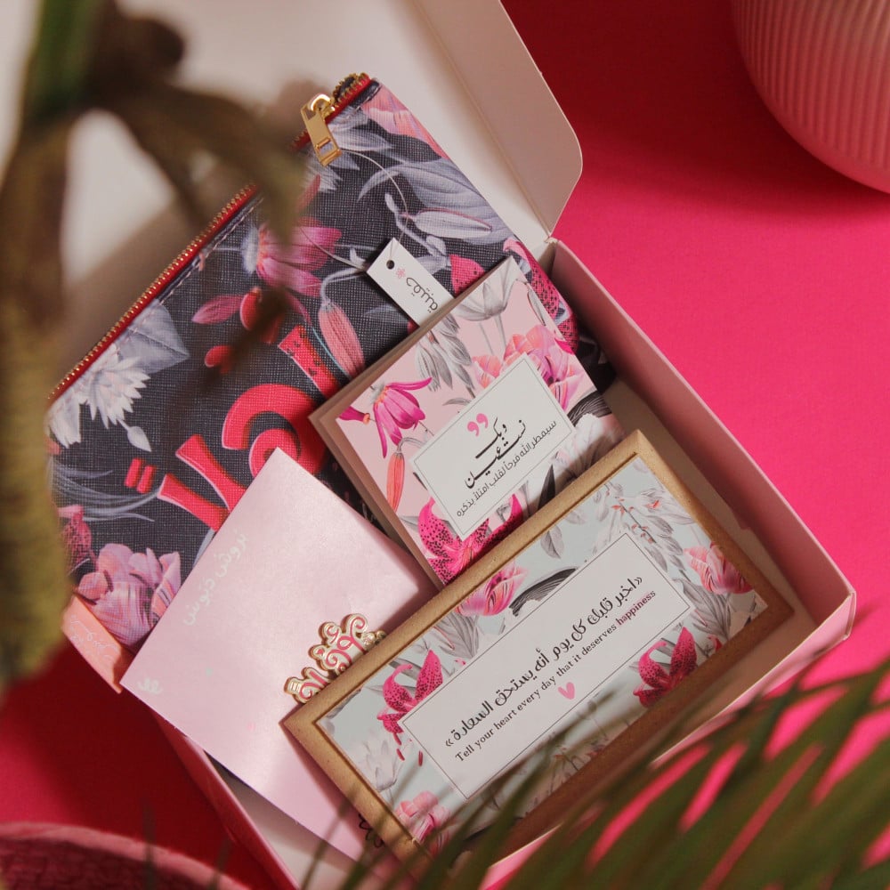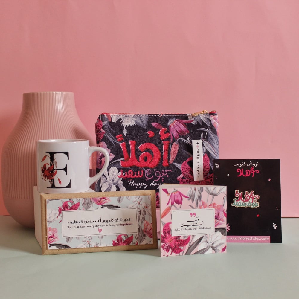 يحتوي على صندوق بلون الوردي الدافئ وشعار ( أهلاً بيوم سعيد ) ببصمة ذهبية فاخرة